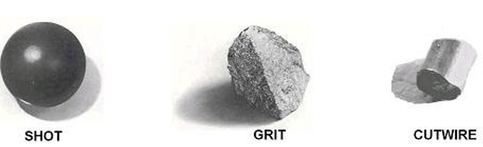 De forskellige former for blæsemiddel-partikler kan opdeles i tre kategorier: shot (rund), grit (skarp) og cutwire.