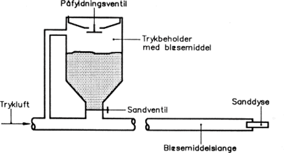 Tegningen viser opbygningen af et trykanlæg. Blæsemidlet opbevares i trykbeholder og doseres gennem en ventil ned i en luftstrøm, hvorefter sand/ luftblandingen trykkes frem til sanddysen, hvor strømmen accelereres og slynges mod emnet.
