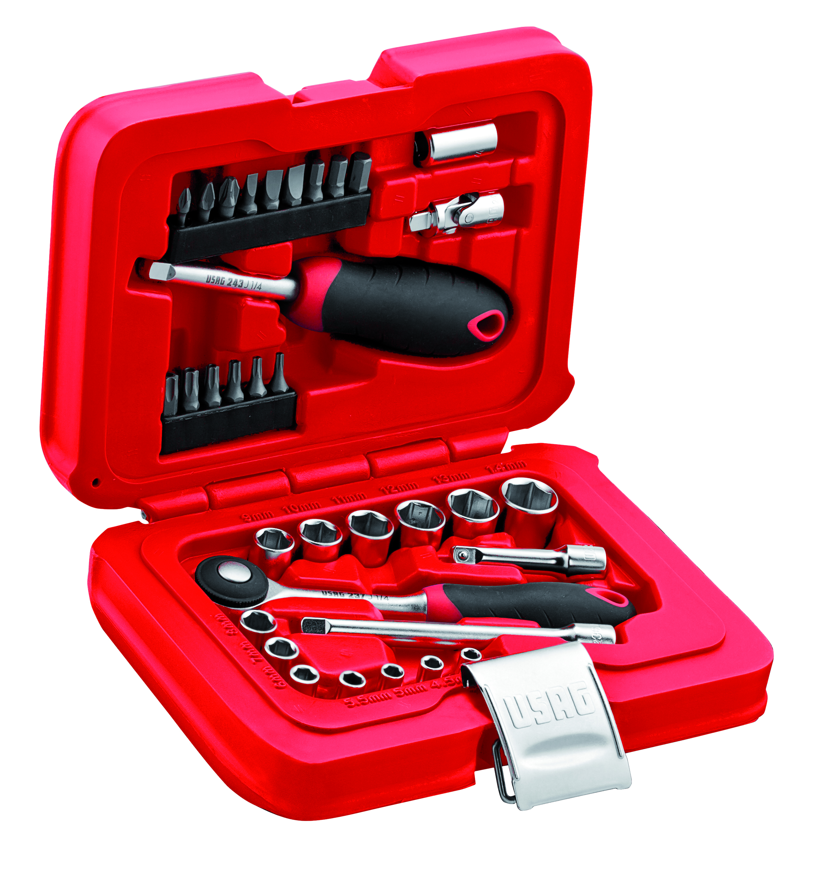 1/4" reversibel skralde med 72 tænder og udløserknap til stikkontakt inkluderet