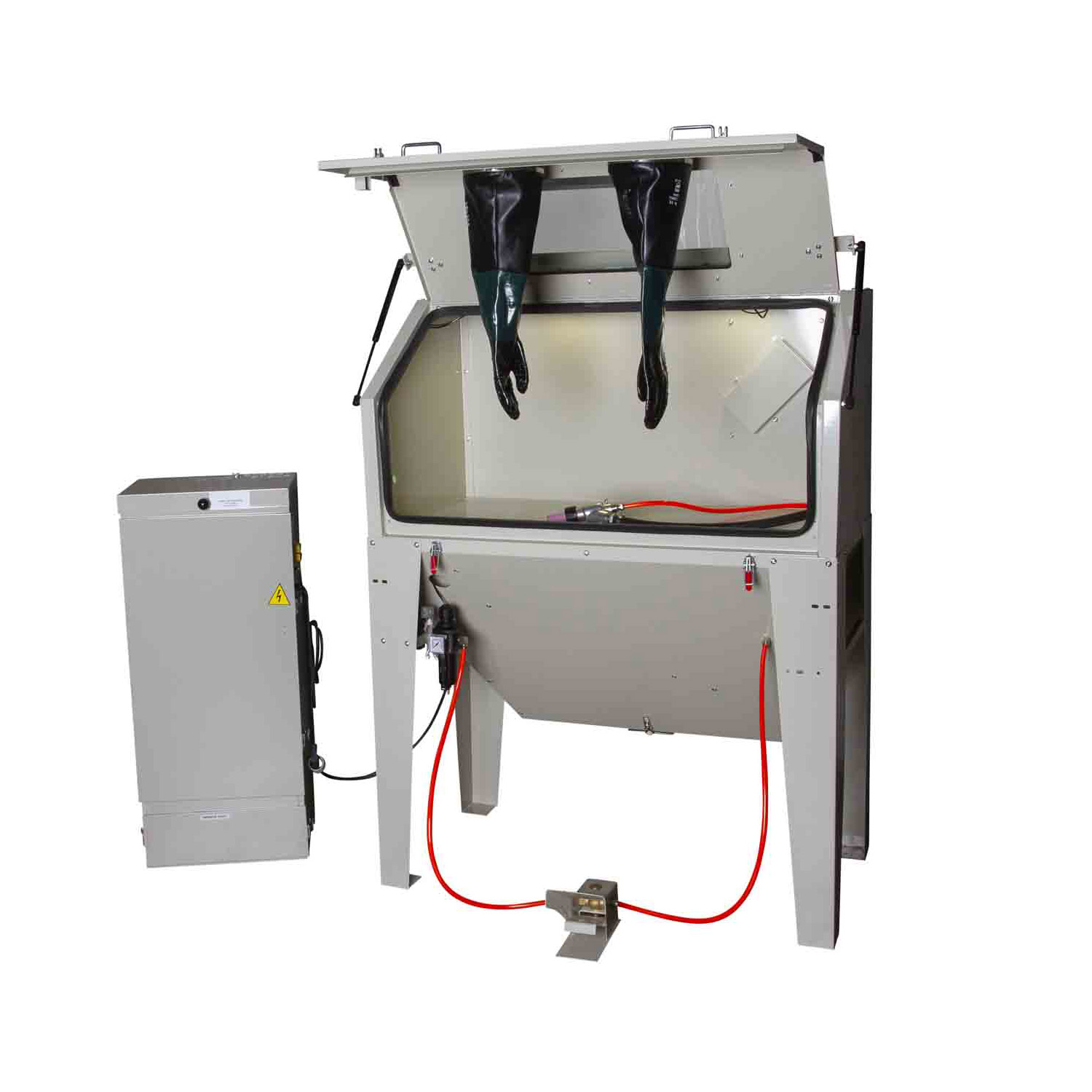 Med industrimodel 424A får I en effektiv sandblæsekabine, som vores eget værksted har opg raderet med kraftigere fødeslanger og specialfremstillet sugebundstykke forkraftigere og mere jævn blæsestråle.