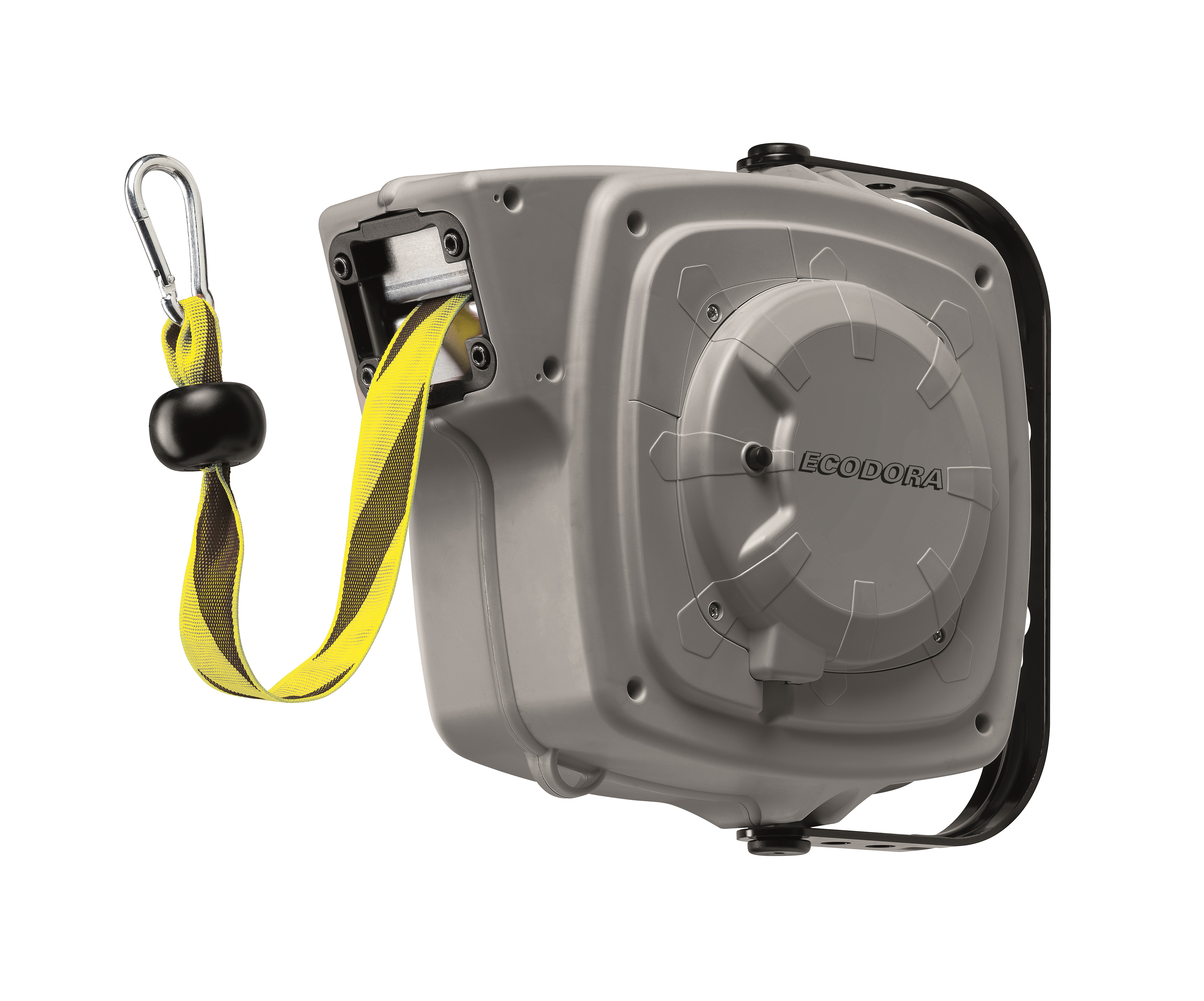 Ecodora opruller med afspærringsbånd (40 mm bredt). Denne slidstærke opruller er udviklet til krævende miljøer, hvor holdbarhed og driftssikkerhed er afgørende. Den er særligt velegnet til brancher som industri, produktion, autoværksteder og landbrug.