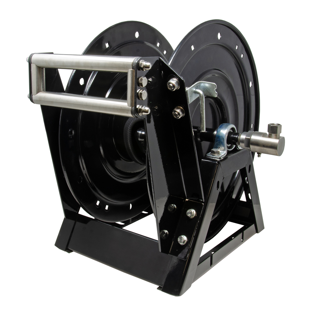 Oprulleren er fremstillet i kraftigt svejset stål med rustfri beslag og pulverlakeret overflade, hvilket sikrer lang levetid og optimal korrosionsbeskyttelse. Drejeleddet i rustfrit stål med indvendige kuglelejer kan klare op til 345 bar (5.000 PSI), og de hærdede tandhjul i motoren sikrer driftssikkerhed gennem mange års brug.