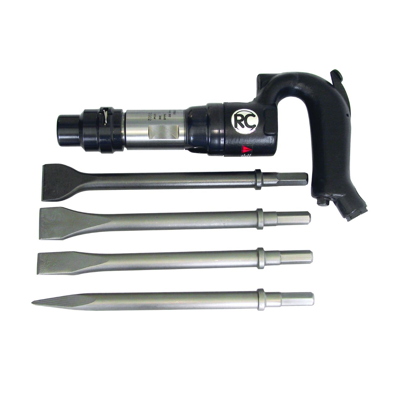 Lufthammer sæt, til sten og beton opgaver. Leveres samlet i kuffert: Lufthammer model RC5305 Stålholder model RC76-3 Spidsmejsel 210 mm model RC51S Fladmejsel 210 x 20 mm model RC52S Fladmejsel 210 x 30 mm model RC53S Fladmejsel 210 x 40 mm model RC54S Slagkraft: 6 joule Slag per. min.: 3000 Tilslutning: 1/4" i.g. Min. slangedimension: 5/16" Holder str.: 12 mm hex