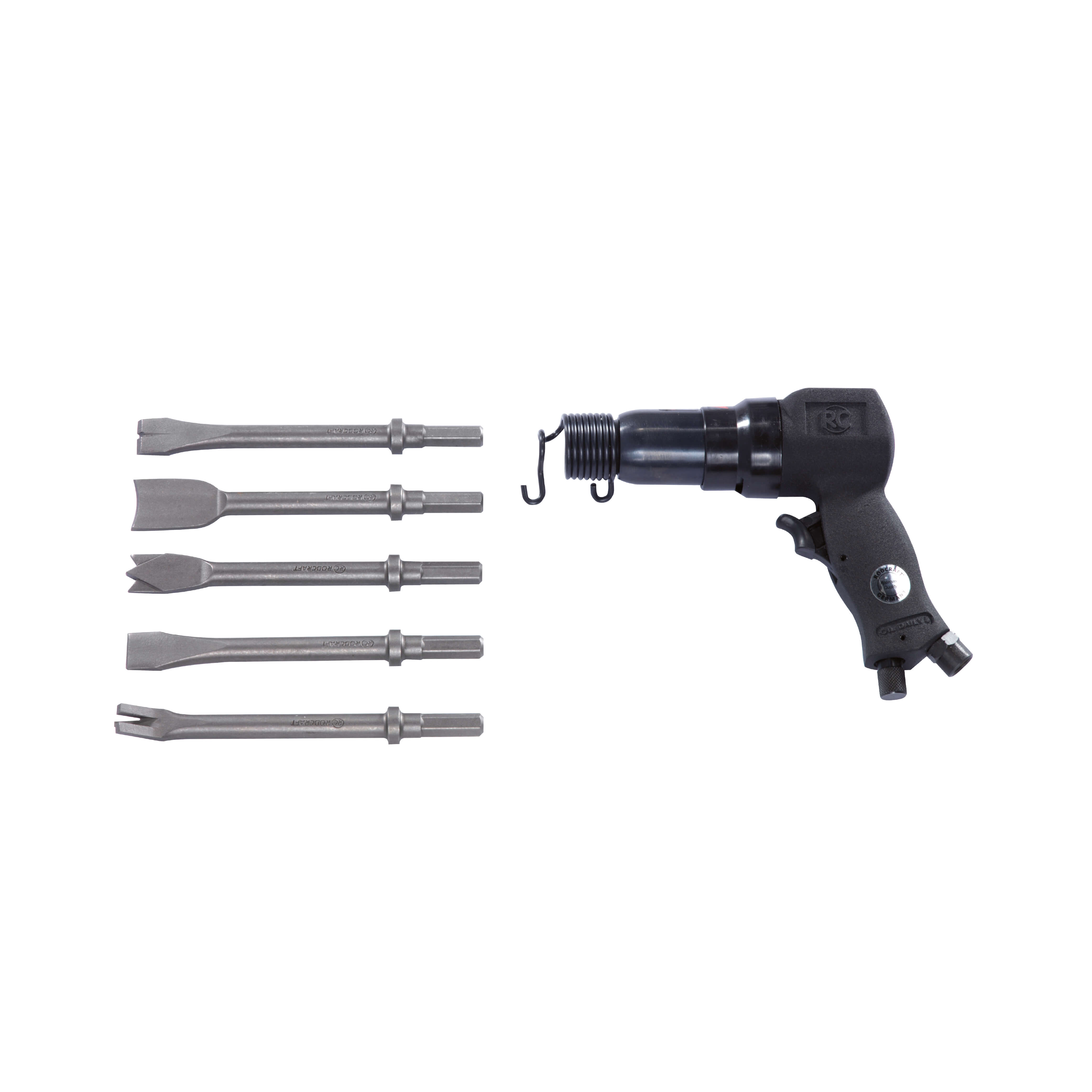 Lufthammer sæt til metalopgaver. Leveres samlet i kuffert Lufthammer model RC5100 Fjedreholder model RC70 Mejsel til afmontering af nitter model RC22S Svejsepunkt mejsel model RC19S Dobbeltbladet skæremejsel model RC60S Fladmejsel model RC20S Buet splitmejsel model RC18S Slagkraft: 6 joule Slag per. min.: 3000 Lydniveau: 94,8 DB Vibration: (ISO-28927-9) 13,2 m/s² Tilslutning: 1/4" i.g. Holder str.: 11 mm hex