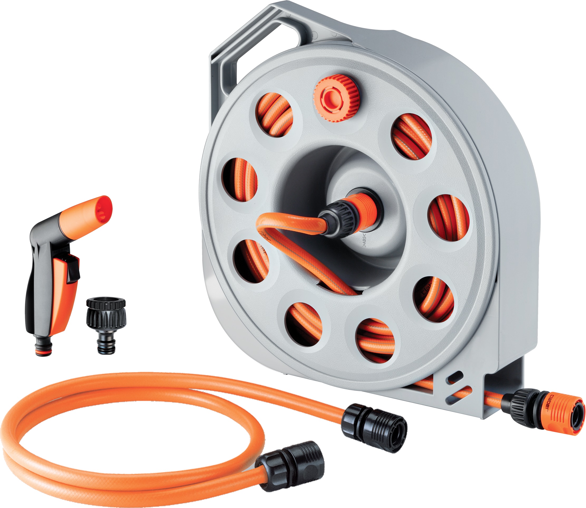 - Aquapass®, den oprindelige Claber slangekassette: Slangen kan trækkes ud lige så langt som nødvendigt og rulles ind igen med drejeligt oprulningsgreb. Med Aquapass er der altid vand til rådighed: på campingpladsen, på båden, og ved fritidsaktiviteter. Sættet indeholder. - 20 meter 9-13 mm slange. - Multigevind-tilslutning. - Forlænger med koblinger. - Pistol med to vandedyser.