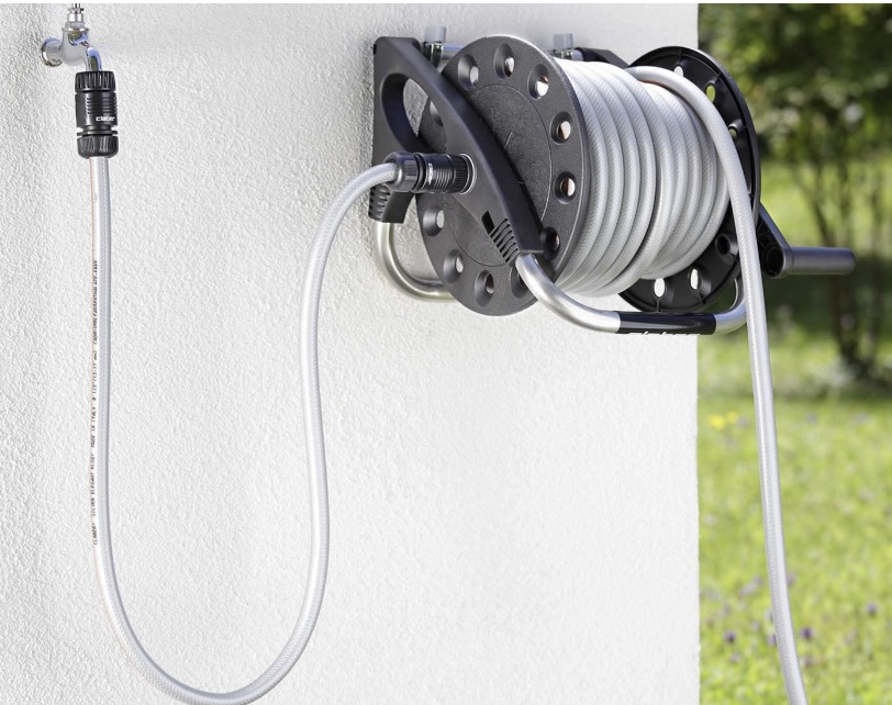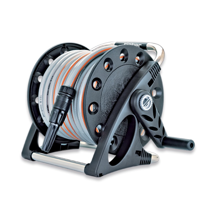 Kompakt slangeopruller, som du kan hænge på væggen eller transportere, hvor du ønsker, uden pladsproblemer.